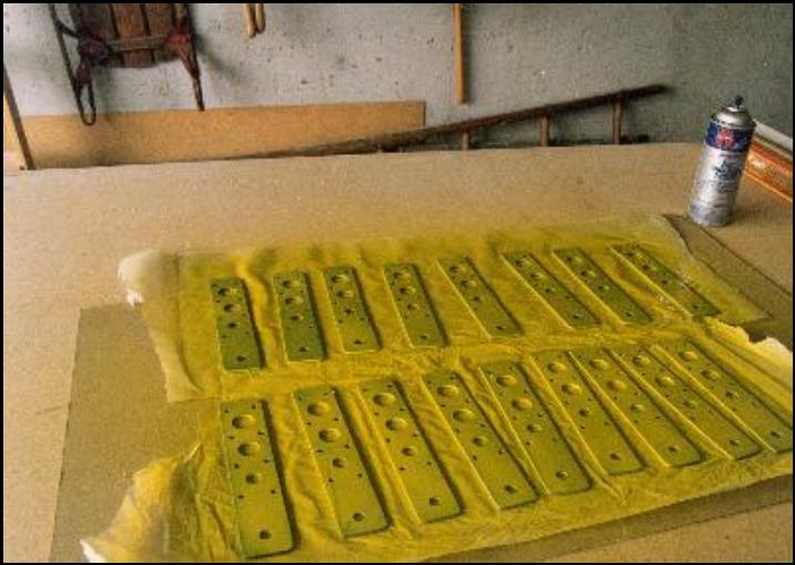 I made my wing attach fittings (WAFS) using 4130 sheet steel from Airparts in Kansas City, Kansas. I had access to tools from a company I was doing engineering consulting for at the time I built these. Otherwise I would not recommend doing these yourself; just the cost in getting the right tools will be expensive. They are painted with zinc chromate primer for corrosion resistance. I also used an AutoCad template for accuracy. |